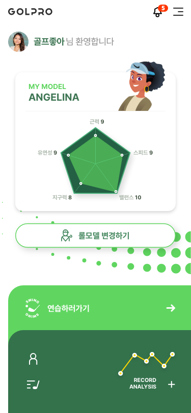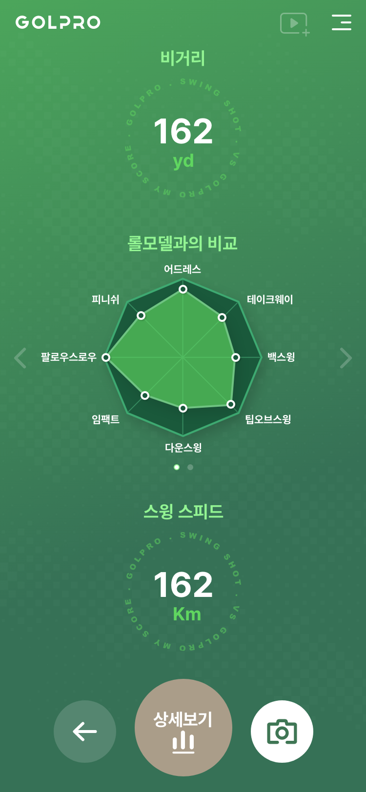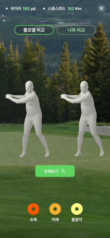프로 롤모델과 나의 자세 차이점을 분석하여, 보다 효과적인 스윙을 위한 정밀 데이터를 제공받을 수 있으며, 연습별 기록을 통하여 스윙 실력의 향상을 직관적으로 확인할 수 있습니다.